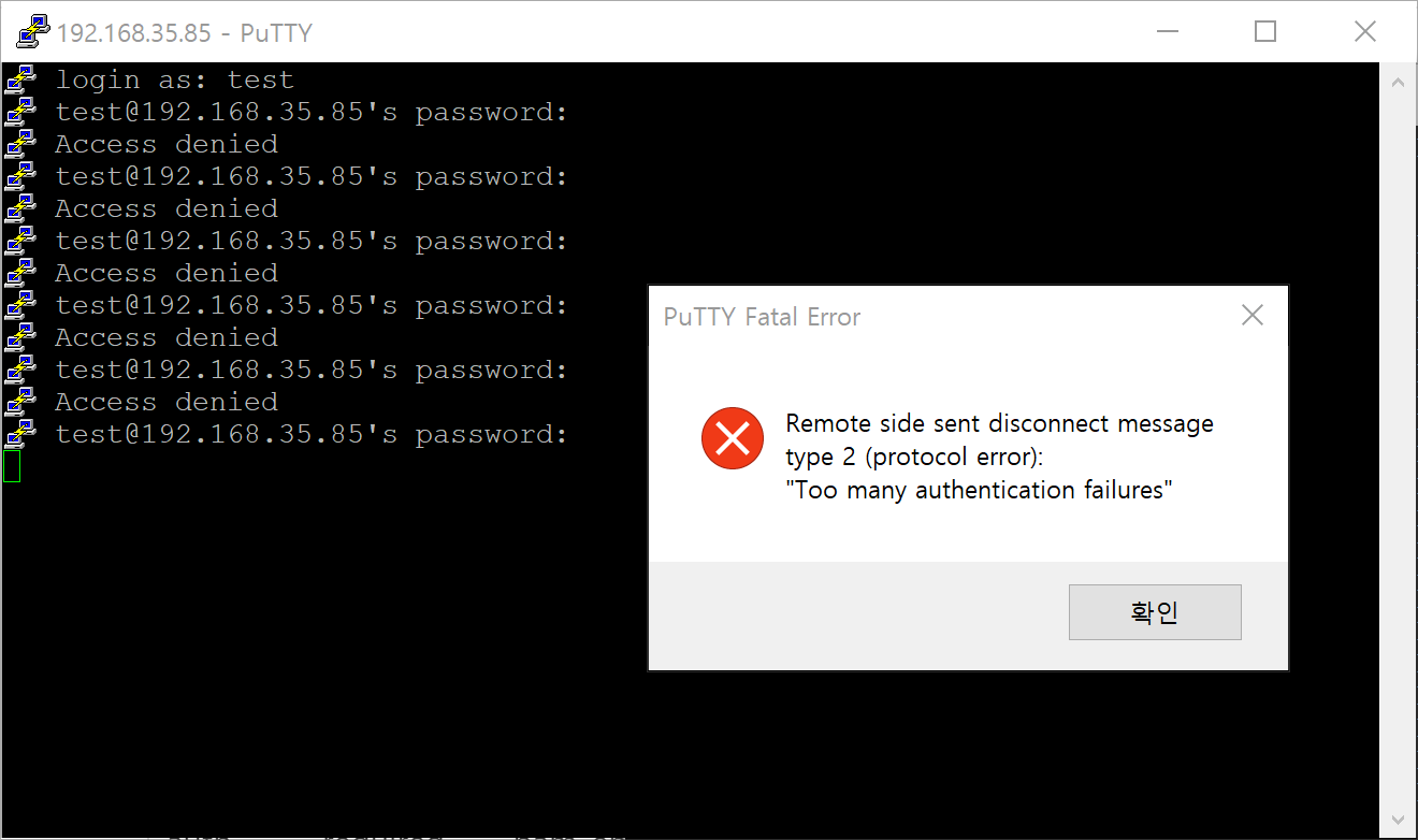 설정 후 5번의 비밀번호 입력 실패 후 임계치를 초과했다는 메세지가 발생한다. 이러한 임계치를 설정함으로써 일반 계정으로의 무작위 패스워드 공격에 대비할 수 있게 된다.