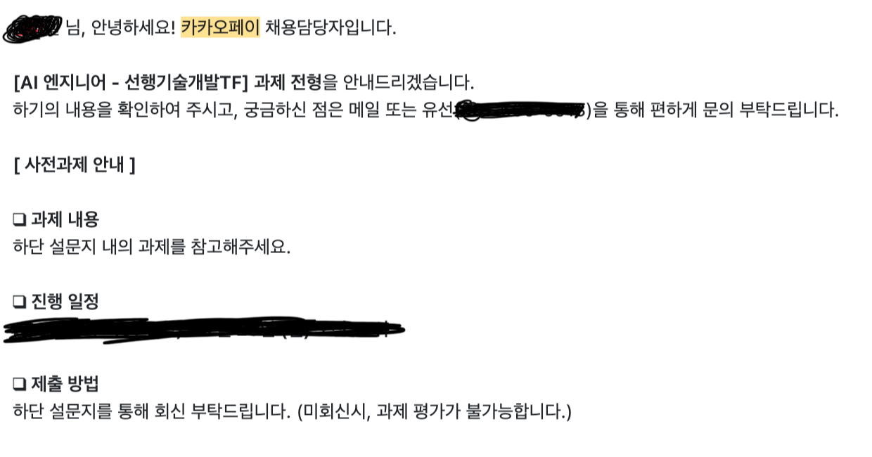 카카오페이 AI 엔지니어 선행기술개발TF 팀에 지원하고 서류과 통과 됐는지 사전과제 수행 메일이 왔다.