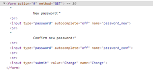 Change 버튼을 클릭할때의 웹페이지 소스를 먼저 보게되면 Get 메소드를 사용하여 password_new, password_conf, change 3개의 파라미터를 서버측에 전달하는 것으로 파악할 수 있다.
