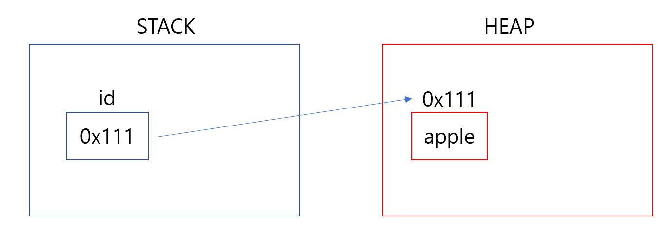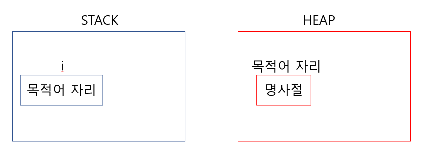 반면에 to eat apple with my family는 다른 문장으로도 표현을 할 수 있고 굉장히 가변적일 수 있다. 또한 절의 길이 너무 길어 stack에 저장하면 굉장히 비효율적이다. 따라서 목적어 자리(주소값)를 stack에 저장하고 HEAP 공간에 명사절을 저장한다고 생각 할 수 있다.