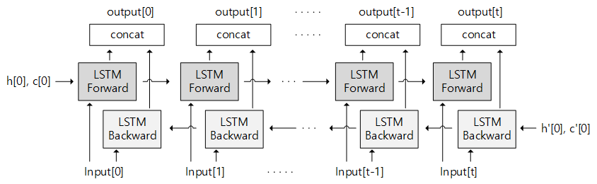 forward와 backward를 각각 LSTM 모델에 넣고 OUTPUT을 Bidirectional 에 input하게 된다.
