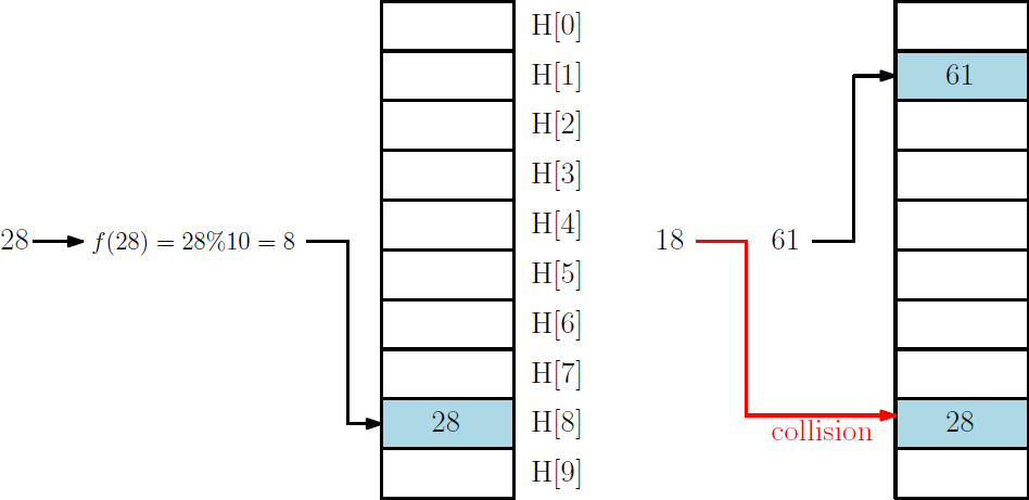 하지만 장점이 있으면 단점이 있는법! index가 중복되는 경우 저장시에 충돌이 발생한다는 것이 단점이다. 해시 함수가 10을 나눈 나머지를 구하는 것이라고 가정해보자. 이러면 숫자 28을 10으로 나누면 8이 나머지이다. 이를 인덱스가 8번인 해시테이블에 28을 저장하여 관리하는 방식이 해시 테이블이다. 하지만 18의 나머지도 8이기 때문에 28과 18 데이터를 저장할테 충돌(collision) 이 발생하게 된다. 이를 해결하는 방법에는 링크드리스트 자료 구조를 사용하는 채이닝 기법과 빈공간을 찾아 저장하는 클로즈 기법이 있다.