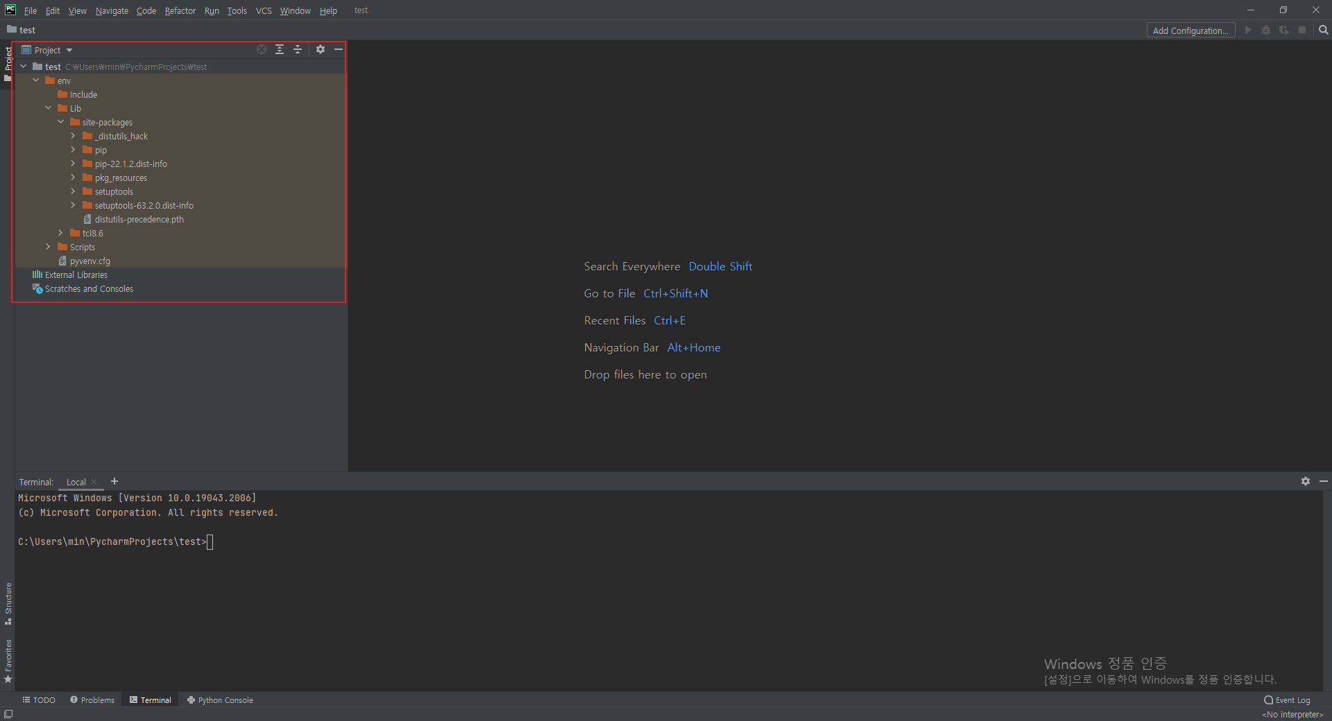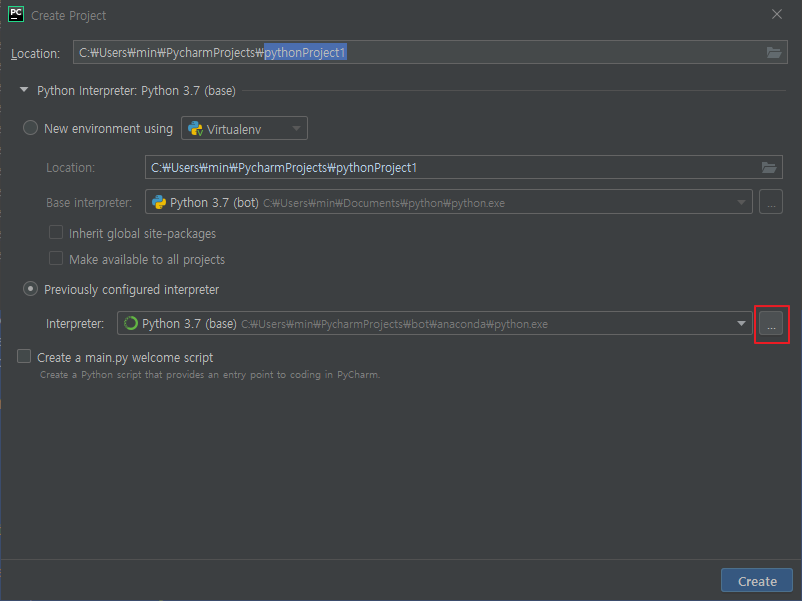 - 파이참에서 create project에서 가상환경에 있는 python.exe를 인터프리터로 지정해야한다. '...' 버튼을 눌러 test가상환경에 저장된 python.exe를 인터프리터로 지정하자.