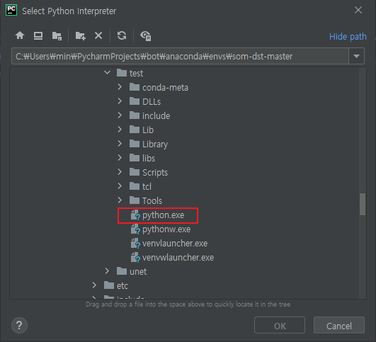 - 아까전 conda 프롬프트에서 확인한 test 가상환경 경로를 찾아서 안에 저장된 python.exe 을 클릭하여 프로젝트를 생성한다.