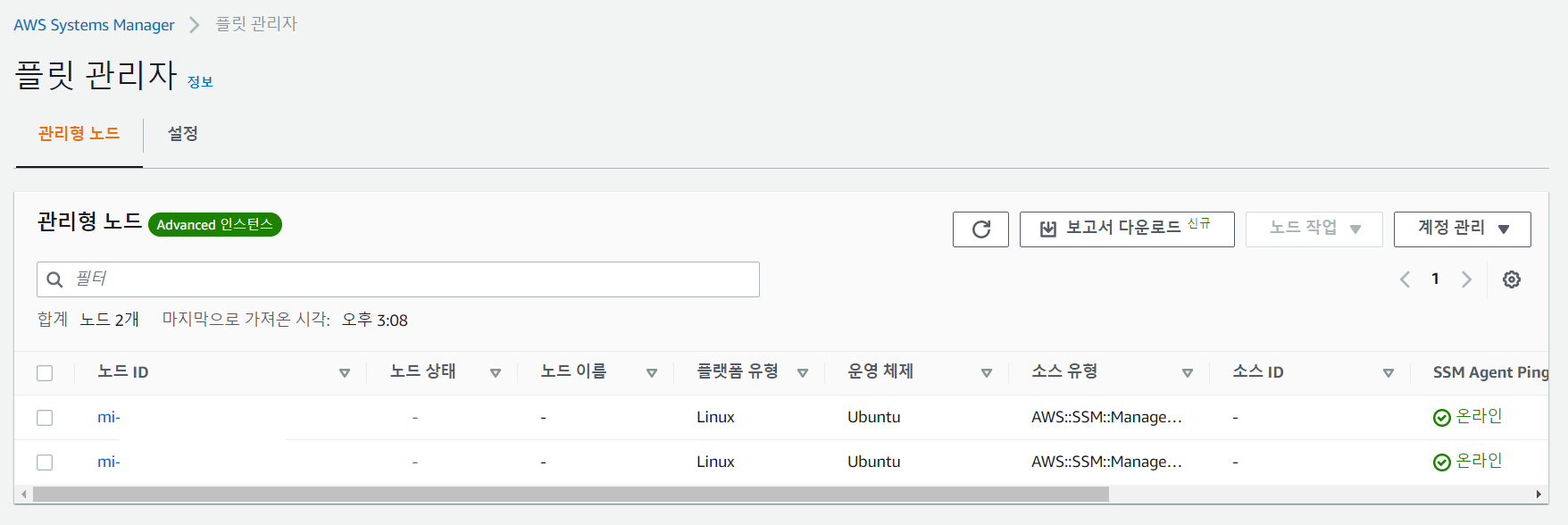 ssm-agent를 실행하게 되면 AWS System Manager 플릿 관리자 화면에서 노드가 추가된 것을 확인할 수 있다. 노드는 1개의 서버를 의미하며 라이트세일은 mi-로 시작되는 ID를 갖는다.