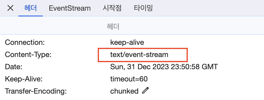 컨트롤러에는 produces로 Content-Type을 MediaType.TEXT_EVENT_STREAM_VALUE 으로 지정하였다. 이렇게 지정하면 서버에서 응답 패킷의 헤더의 Content-Type이 text/event-stream으로 되고 텍스트 데이터를 연속해서 보낼 수 있다.