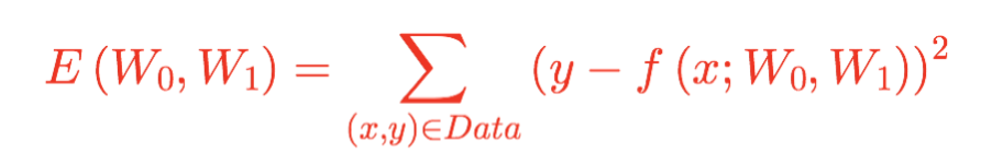 아래의 식은 입력 데이터를 식 $f(x) = W_1 X + W_0$ 에 넣어 얻은 예측값과 실제 값 y와의 차이를 sum 하는 것을 의미한다. 이처럼 학습 데이터 전체의 로스를 더한 값이 가장 작은 방향으로 학습이 진행되는 것이다.